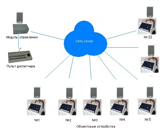 Сеть связи построена по радиальному принципу. В "центре" находится Пульт диспетчера, на периферии - Объектовые устройства.