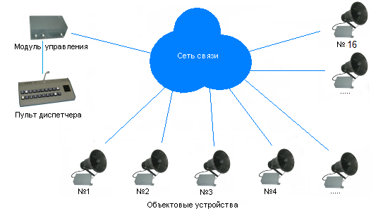 Сеть связи построена по радиальному принципу. В "центре" находится Пульт диспетчера, на периферии - Объектовые устройства.